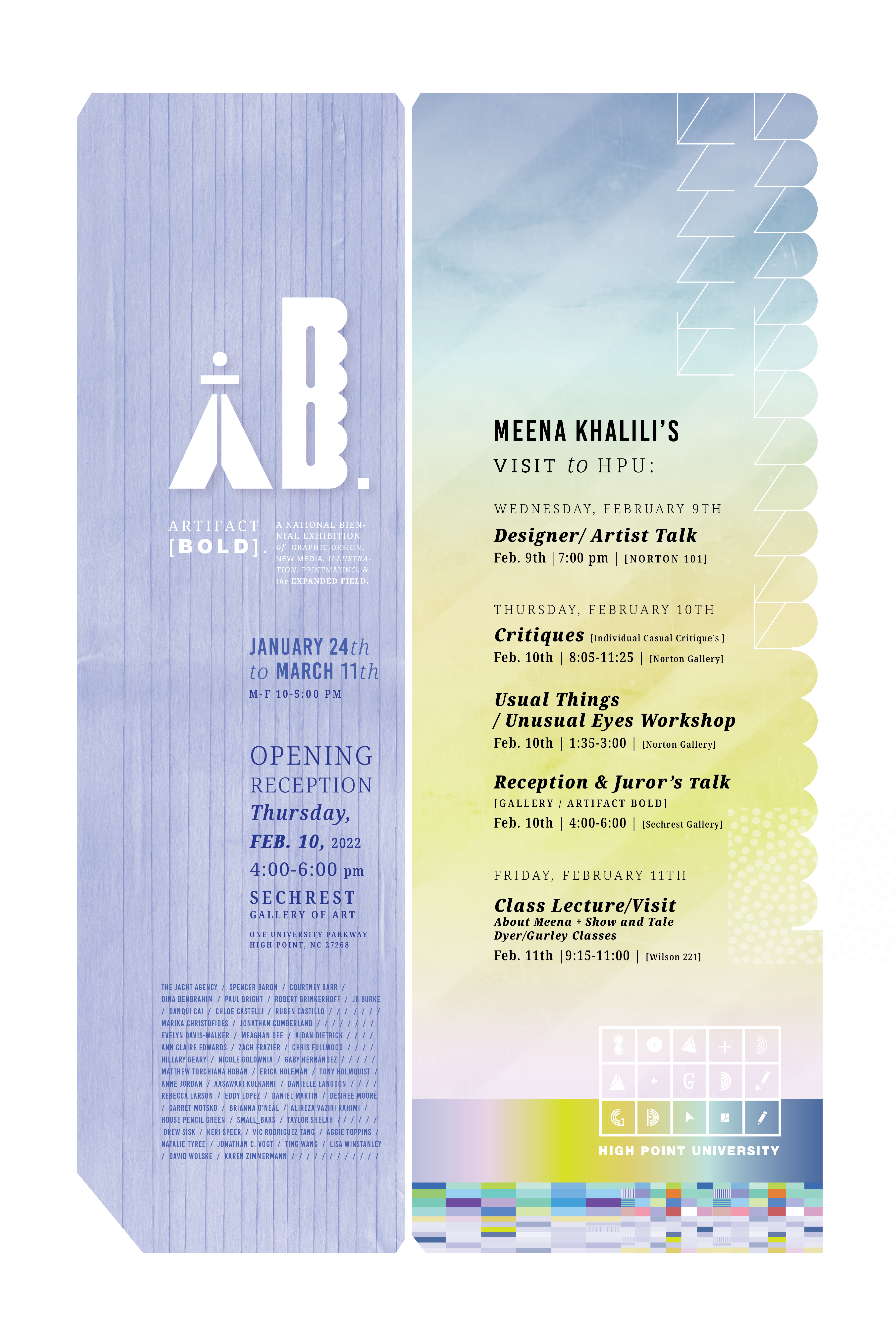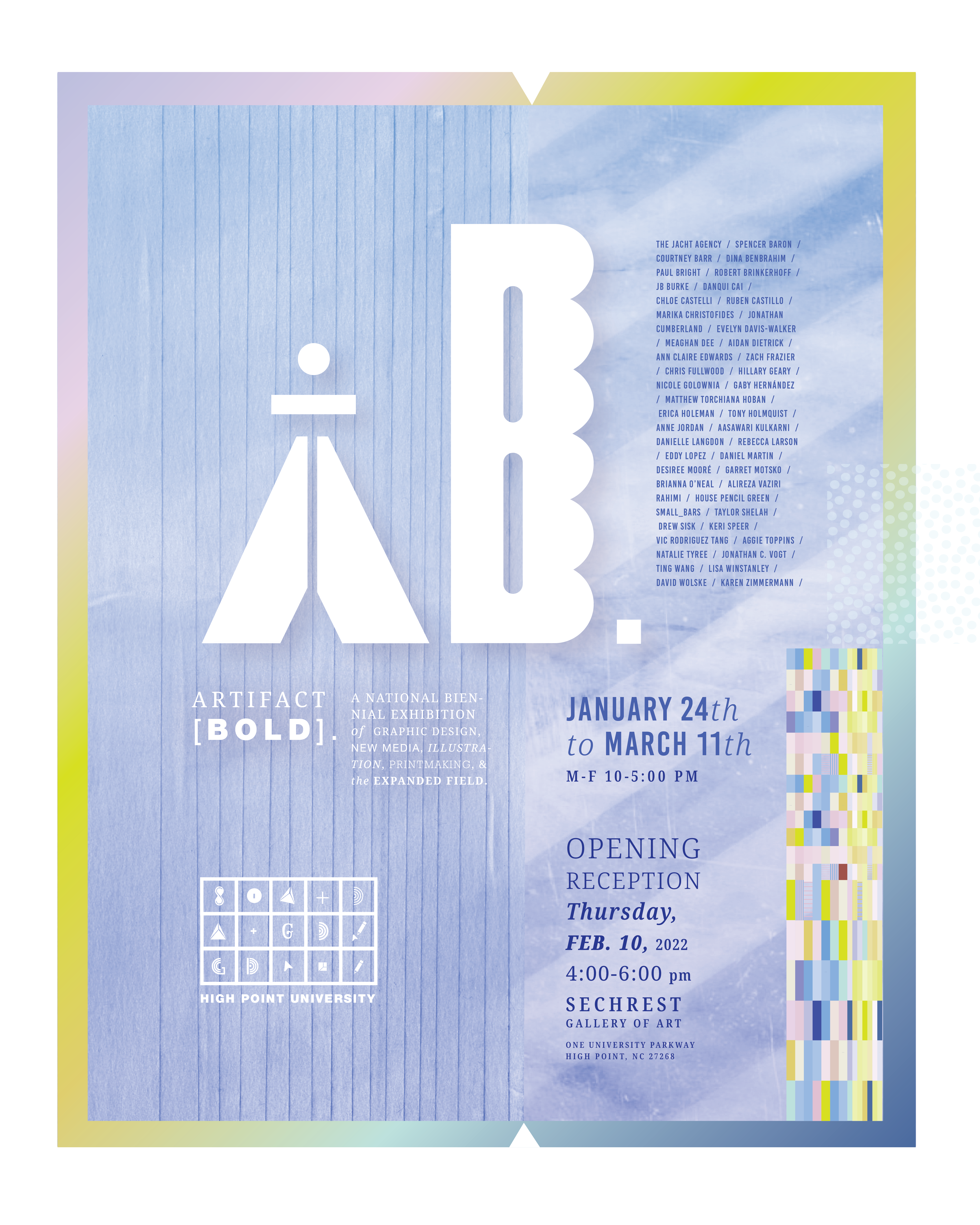 In collaboration with the School of Art & Design at High Point University and Emily Gerhold, ARTIFACT [BOLD] was founded in 2021 as a national biennial exhibition of graphic design, new media, illustration, printmaking, and the expanded field. Whether they are building immersive environments that evoke emotional responses or producing concept-driven type, illustration, or sequence systems, the role of the designer is to create objects that make brave, bold formal and conceptual statements and reflect critical cultural moments.